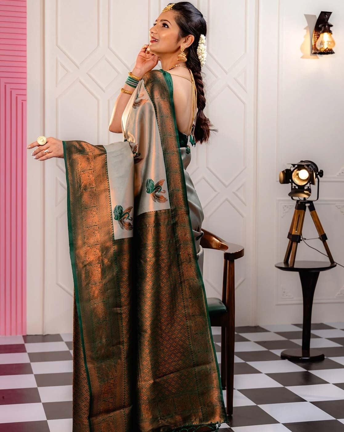 - The last image gives a detailed look of the blouse piece that comes with this saree (The model is wearing a blouse from our in-house wardrobe)