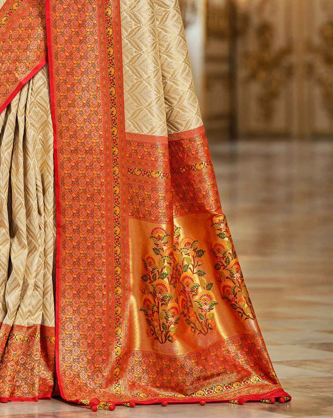 - Print & Pattern :- Ethnic Motif, Work Deatils :- Tassels and Latkans, Occasion :- Traditional/Festive, Type :- Kanjeevaram